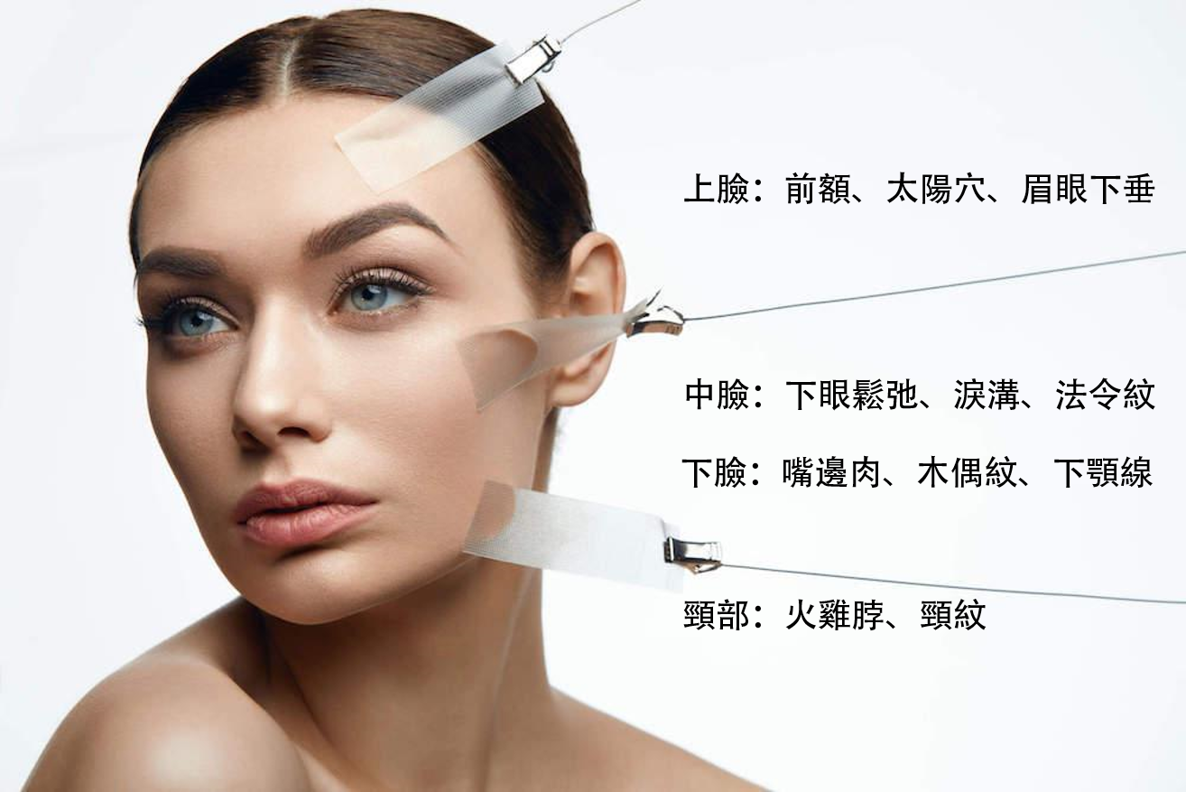 說到臉部拉皮,若以臉區域來分,可分為上臉拉皮、中臉拉皮、下臉拉皮、頸部拉皮。分別能夠改善的地方不太一樣。可參考下圖: